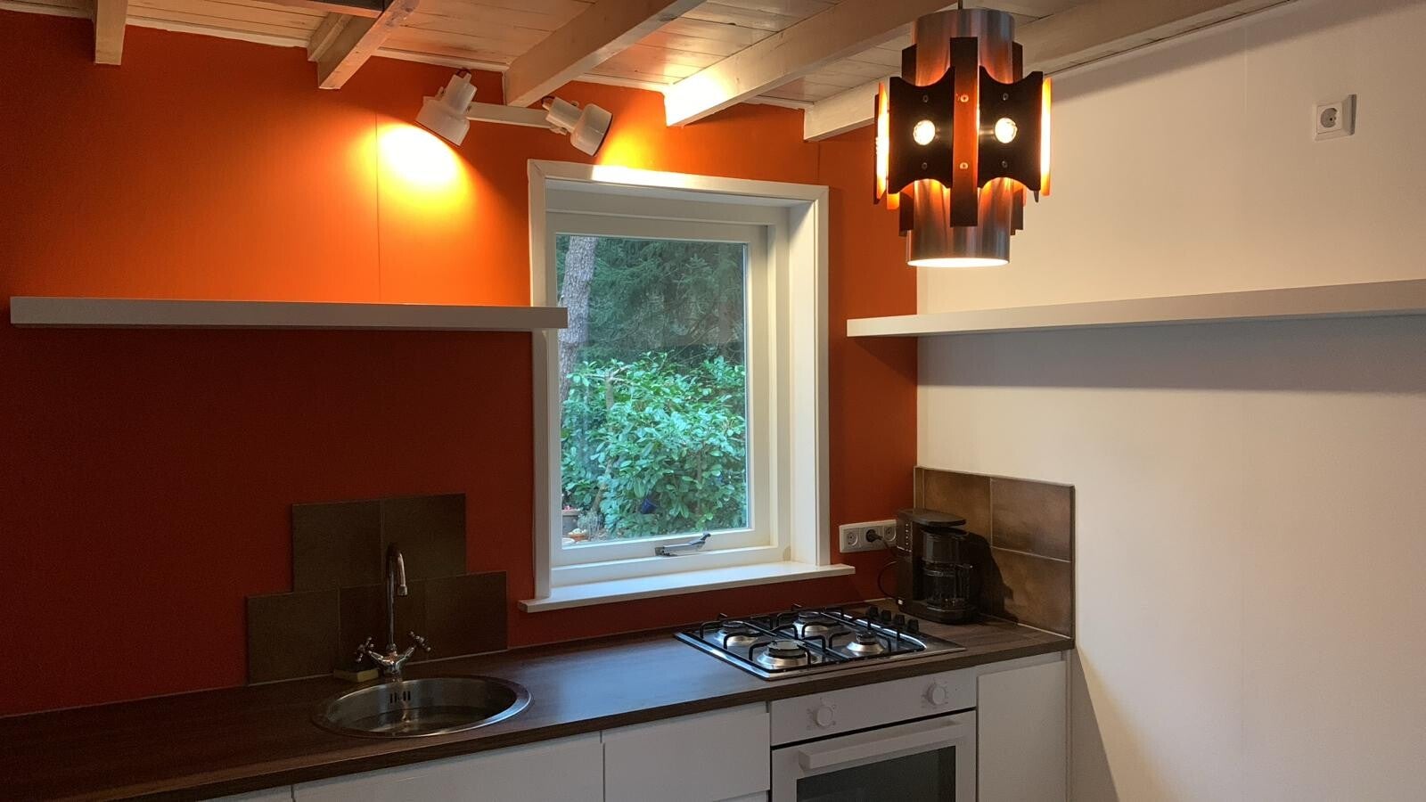 Woonkamer, keuken en verwarming: Het huisje heeft een woonkamer met open keuken en houtkachel. Er is centrale verwarming. Er is een oven en een gasfornuis aanwezig in de keuken. Er staat ook een koffiezetapparaat (met filter) en een melkopschuimer. In de woonkamer staat een eettafel voor vier personen, een bank en twee luie stoelen.